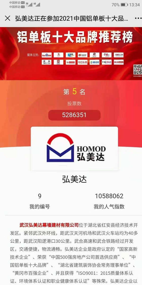 5月11日:【弘美達(dá)】再次入圍2021年度“鋁單板”十大品牌,很榮幸再獲佳績,感謝為弘美達(dá)付出的每一位同仕。